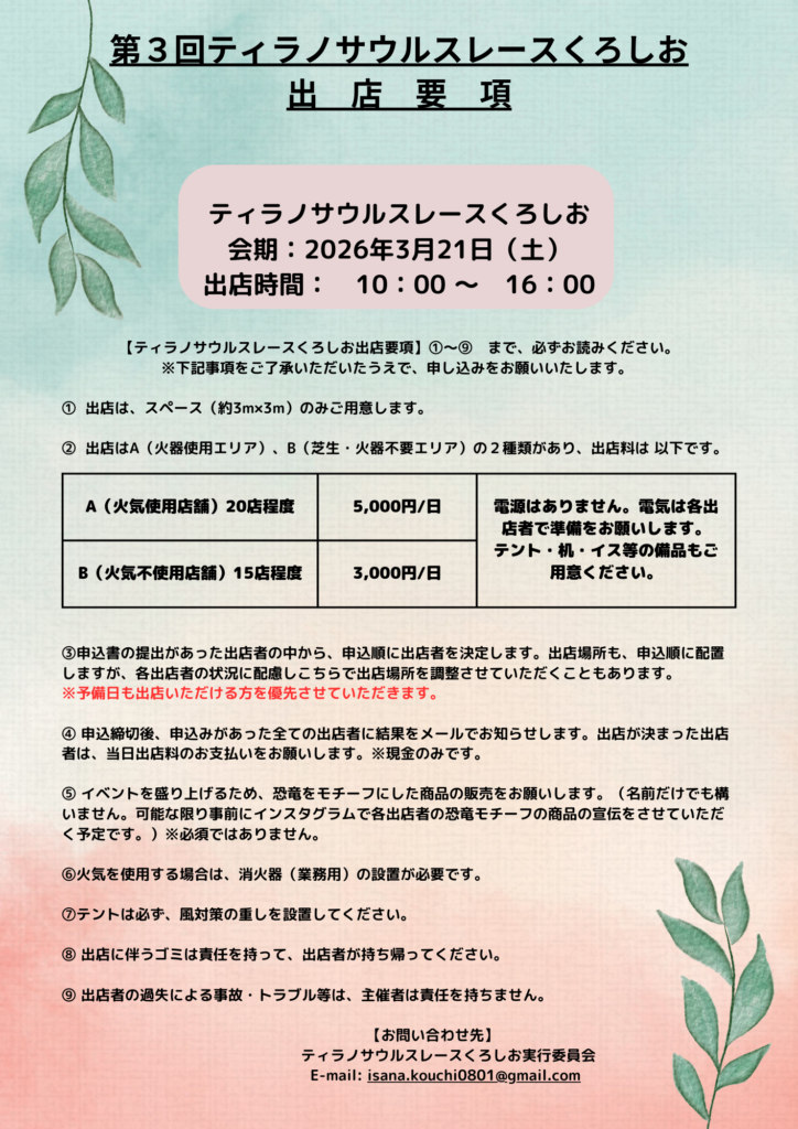 ホーム 未分類 マルシェに出店してくださる方を募集します。 News お知らせ マルシェに出店してくださる方を募集します。 2025.12.24 未分類 お申し込みは下記のURLからお願いします! https://forms.gle/UThKDbg6itE86FMC7 ティラノサウルスレースくろしおが戻ってきます! 「子ども応援チケット」へのご協力をお願いします!